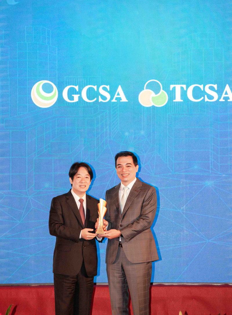 达全方位永续表现获全球永续奖及台湾永续奖肯定,由副总统赖清德颁奖 (左),悟空体育总经理柯富仁 (右) 代表领奖
