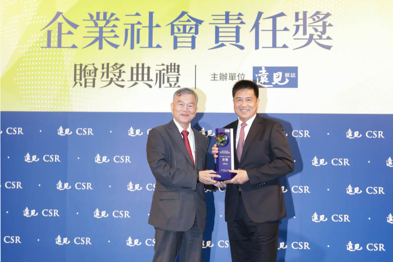 友達光電獲 2019 遠見 CSR 年度大調查「電子科技業組」首獎,由經濟部部長沈榮津頒獎 (左),友達光電董事長暨執行長彭双浪受獎 (右)